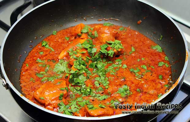 When the gravy is little dried, check if chicken is cooked properly or not. If its undercooked, add some water and cook it for few more minutes on low flame. Please note, chicken will keep cooking further for few minutes even after you have switched off gas, so don’t overcook your chicken. When you are sure chicken is properly cooked add some fresh chopped Coriander Leaves and cook it further with covered lid for 1-2 minutes on low flame.
