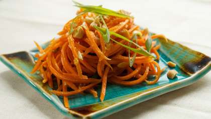 - Heat a non-stick pan and add grated carrots, ginger and garlic.