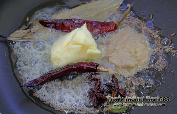 2. Heat 4 tablespoon oil in a non-stick pan and add whole garama masala (1 tsp cumin seeds, 2 star aniseed, 1 bay leaf, 2 green cardamoms, 1 black cardamom and 2 whole Red chilies). Cook it for 30 seconds. Now add 1 tablespoon butter, salt, slitted green chilies, ginger-garlic paste and onion paste. Cook it for 2-3 minutes till the onion paste turns little pink in color. Add cashew nuts paste and cook it for 3 to 4 more minutes.