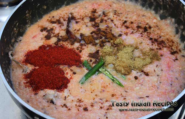 3. Now add Tomato puree and 2 teaspoon Kashmiri Red Chili Powder, 3/4 teaspoon Garam Masala Powder and 1 teaspoon Coriander Powder. Mix it well. If you are adding normal red chili powder, then you may add only 1 teaspoon of it, because normal red chili powder is more spicier than Kashmri Red chili powder. I have used Kashmiri red chili powder to make my dish more colorful.