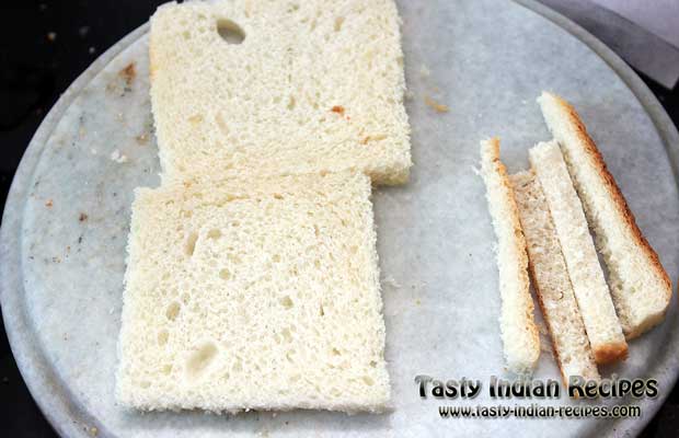 - Heat good amount of oil in a frying pan on high heat and slightly trim the edges of 6 bread slices. Apply some Green Chutney on all bread slices and combine two bread slices, so that you will be able to make 3 pakore.